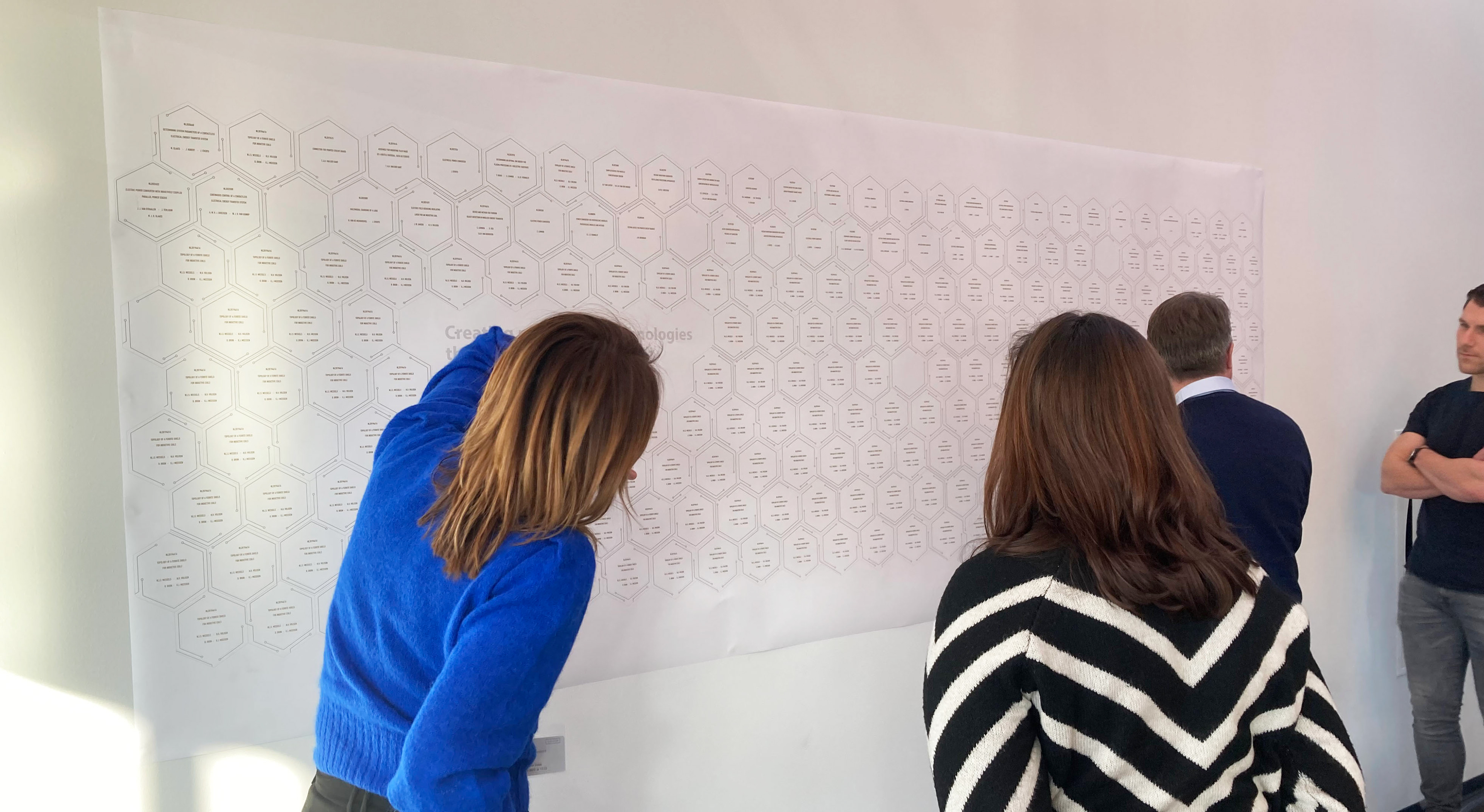 Een subtiel 3D-patroon van een Printplaat* dat zich in lagen uitstrekt, verbindt alle tegels met elkaar en symboliseert de oorsprong van het bedrijf. Het resultaat is een indrukwekkend display dat de innovatieve geest van Prodrive Technologies benadrukt. Hun missie, "Creating meaningful technology that makes the world work," wordt prominent in het midden weergegeven, ondersteund door de toevoeging "Innovating since 1993," verwijzend naar het 30-jarig jubileum van het bedrijf.
